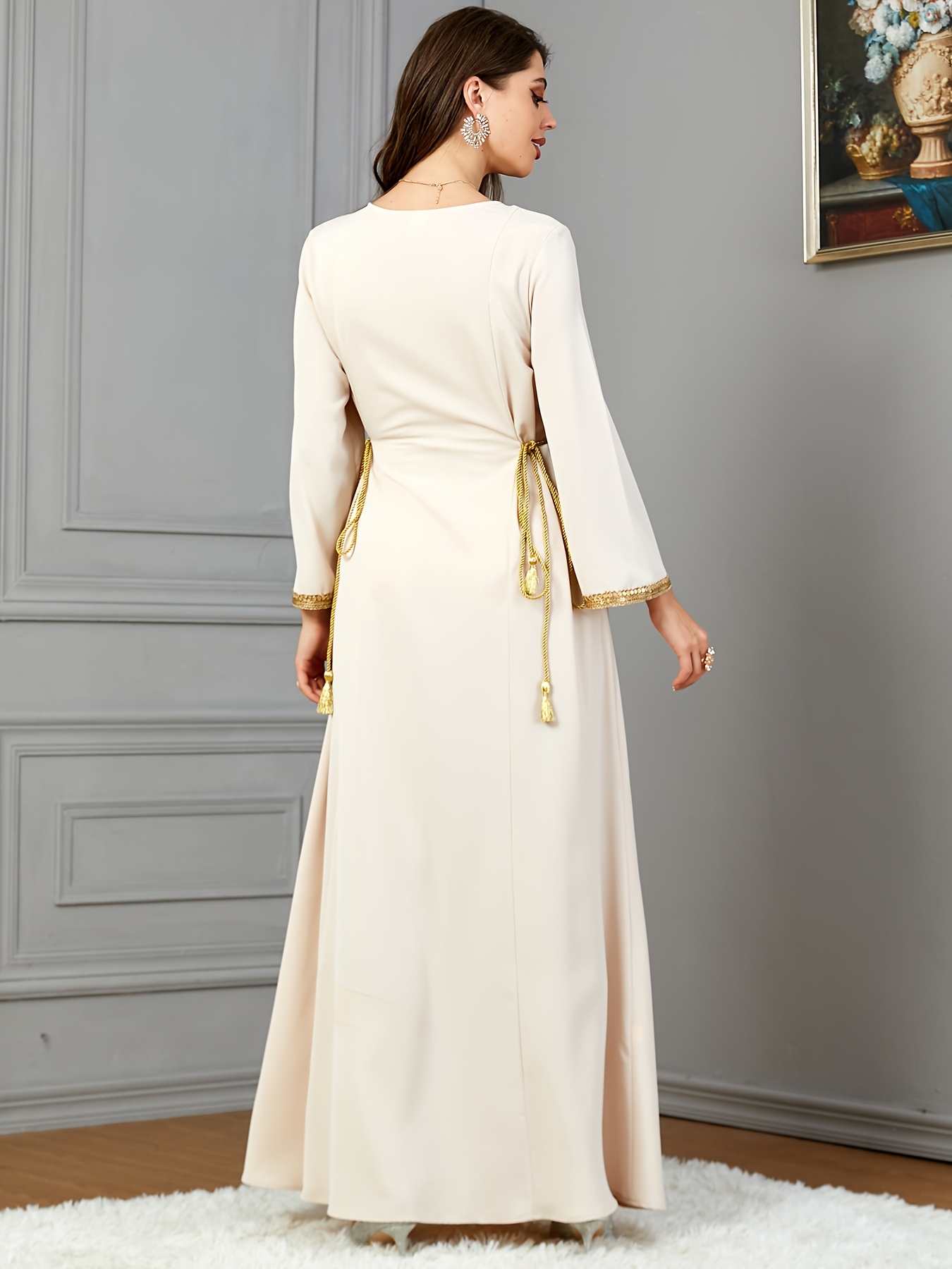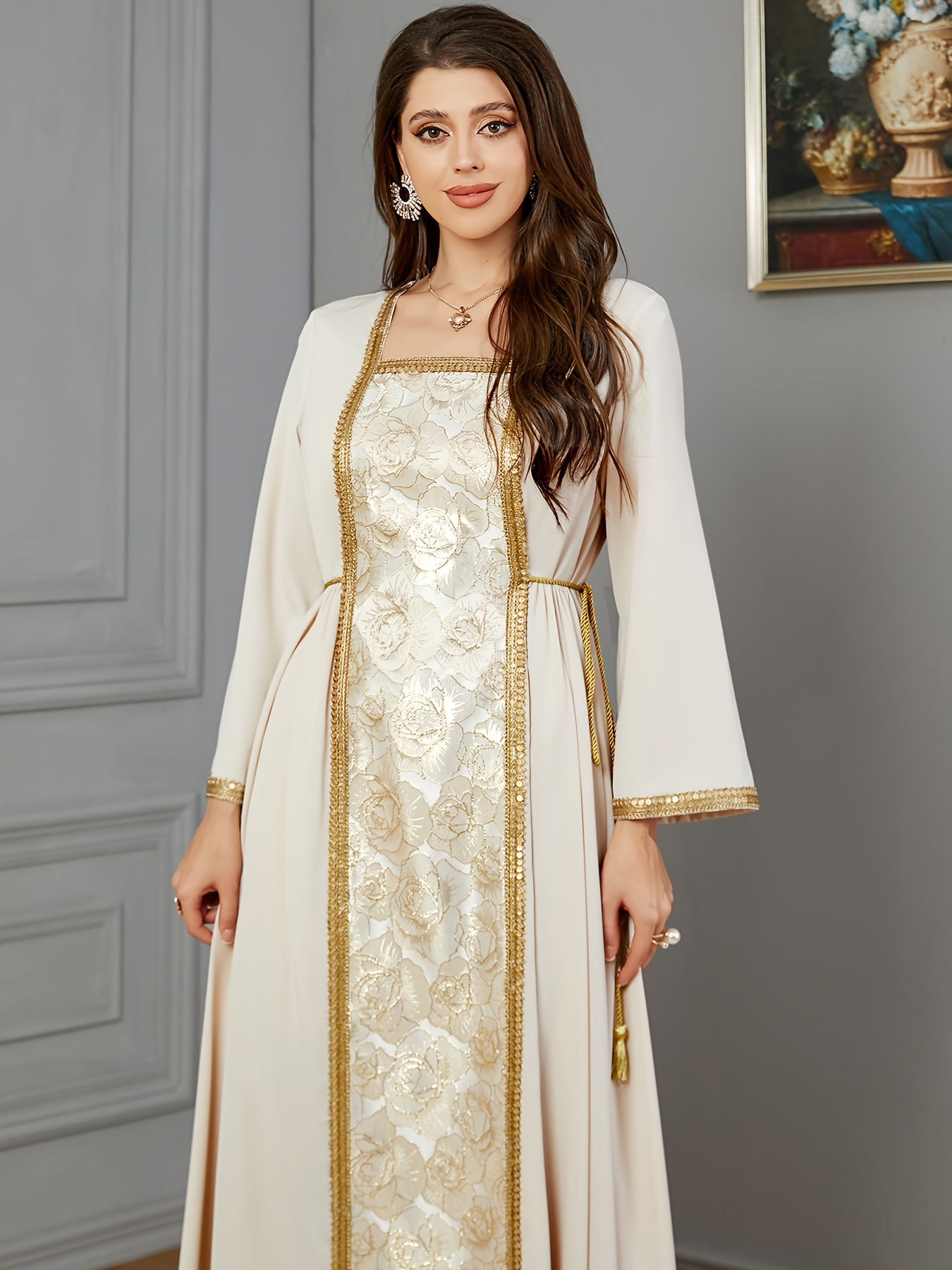 Elegant Golden Embroidered Abaya Dress - Long, Elegant Dress with Intricate Golden Floral Patterns, Perfect for Eid Celebrations, Festive Attire|Elegant Abaya|Long Abaya