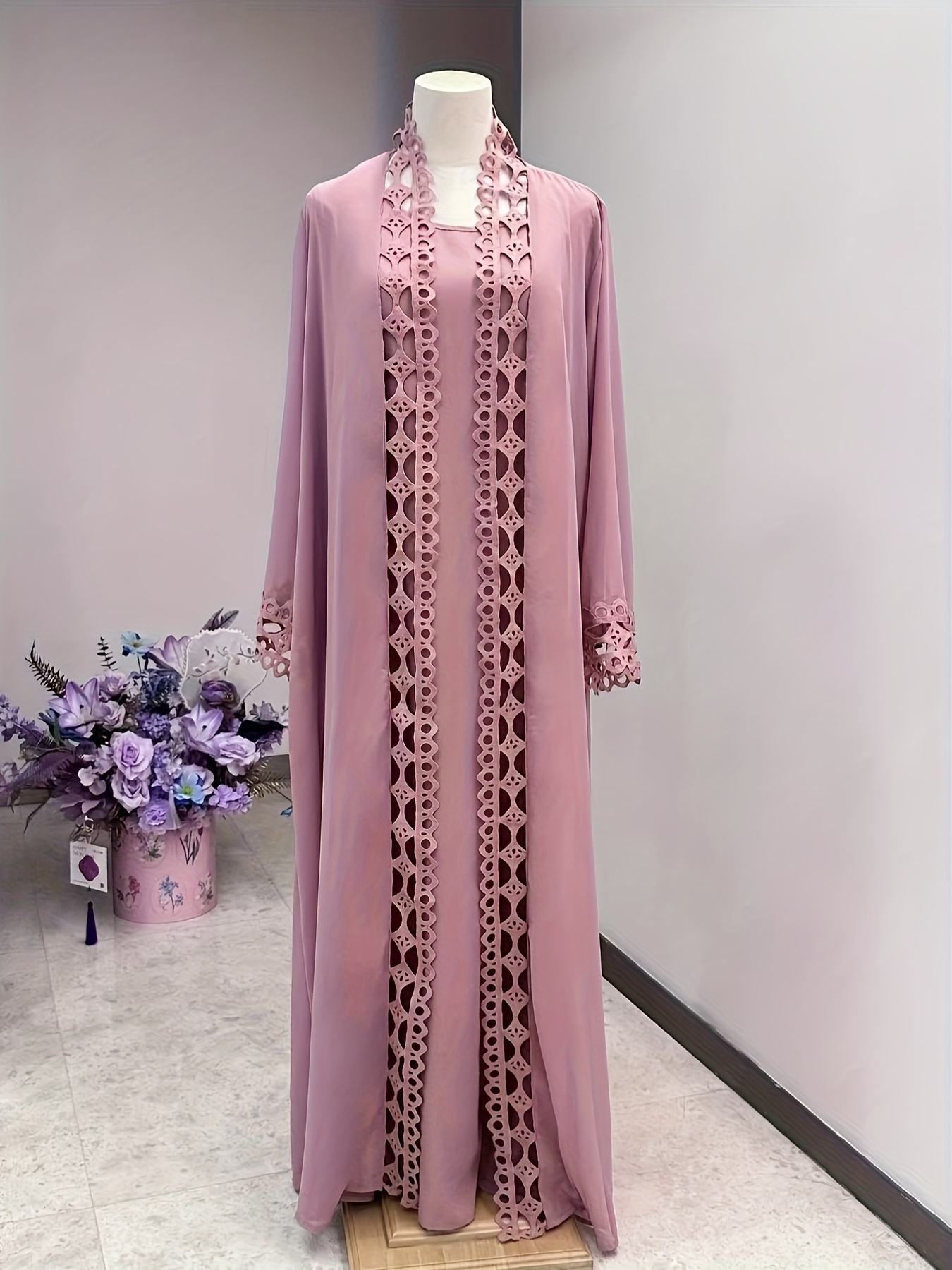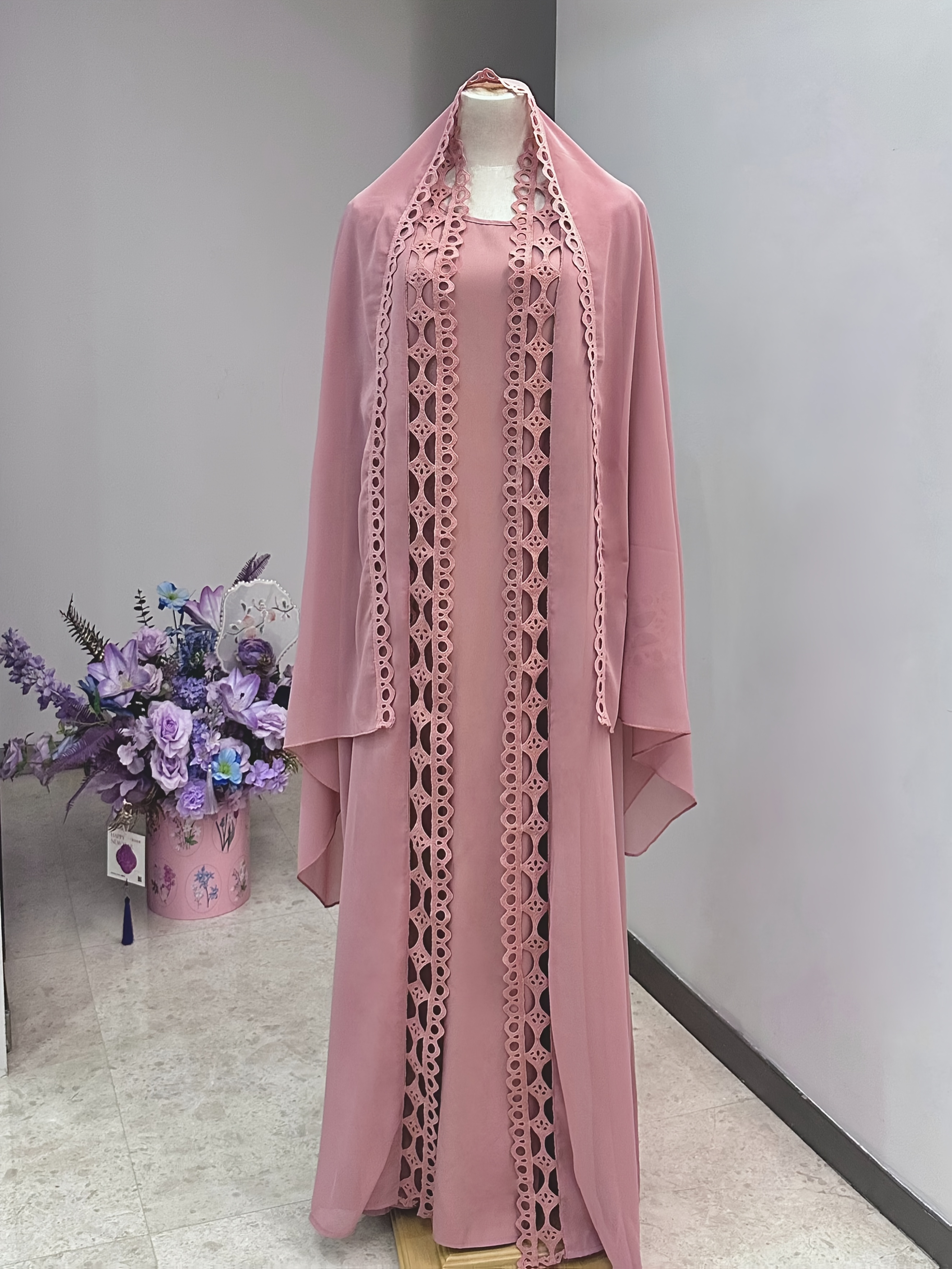 Middle Eastern Muslim Fashion Long Sleeve Embroidered Contrast Lace Patchwork Abaya Dress and Hijab Three-Piece Set