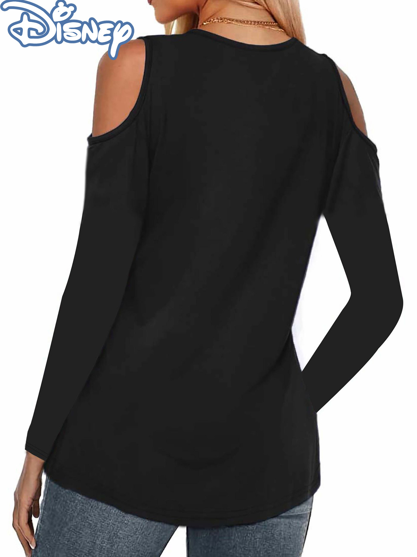 Women'S Disney Princess Graphic Off-Shoulder Long Sleeve T-Shirt - V-Neck, Black with Colorful Floral Crown & Castle Design, Perfect for Spring/Fall, Disney Shirts