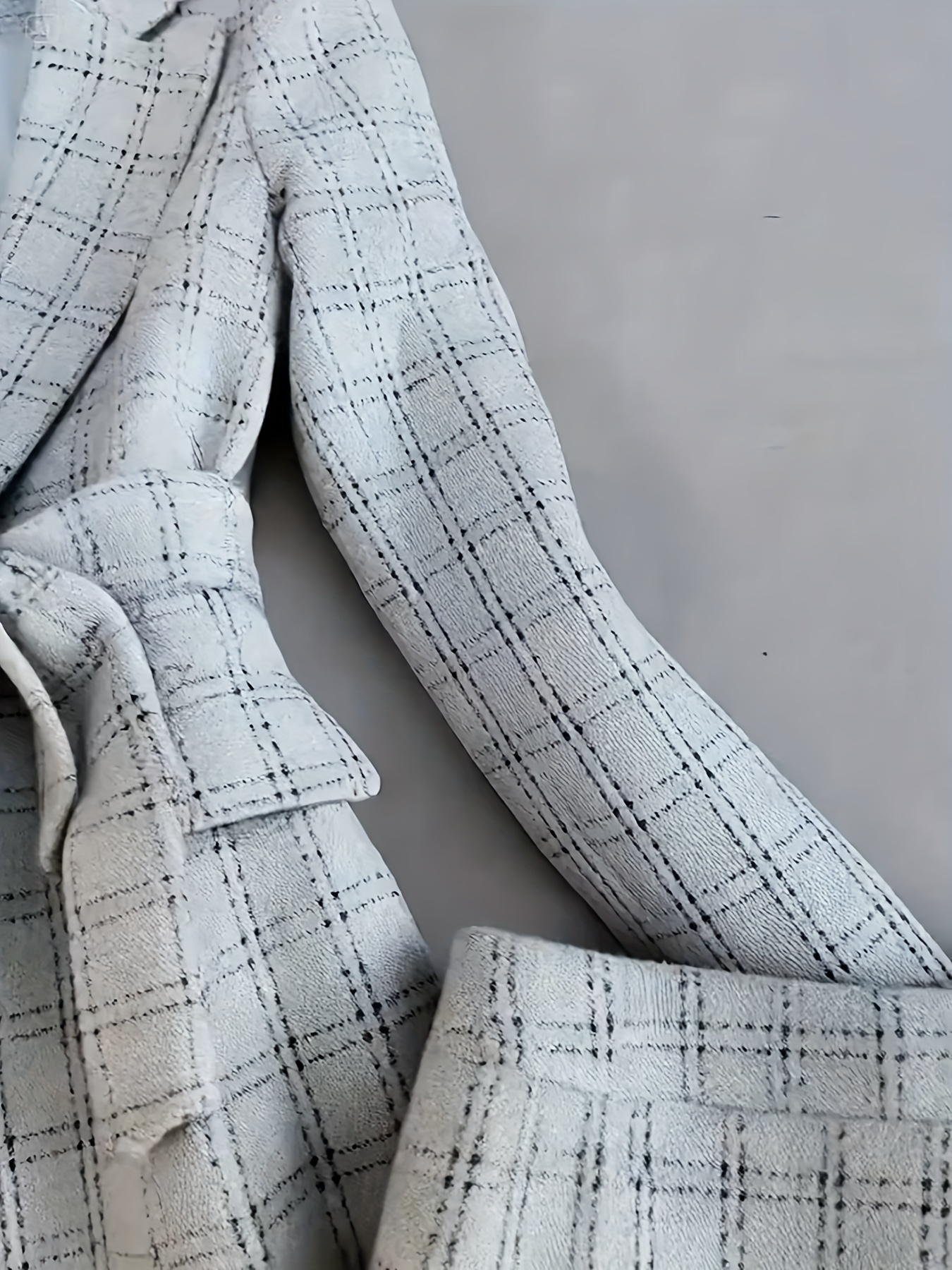 [Chic Plaid Suit] Long Sleeve Plaid Midi Suit Jacket and Skirt Set, Chic Women's Halter Dress Outfit