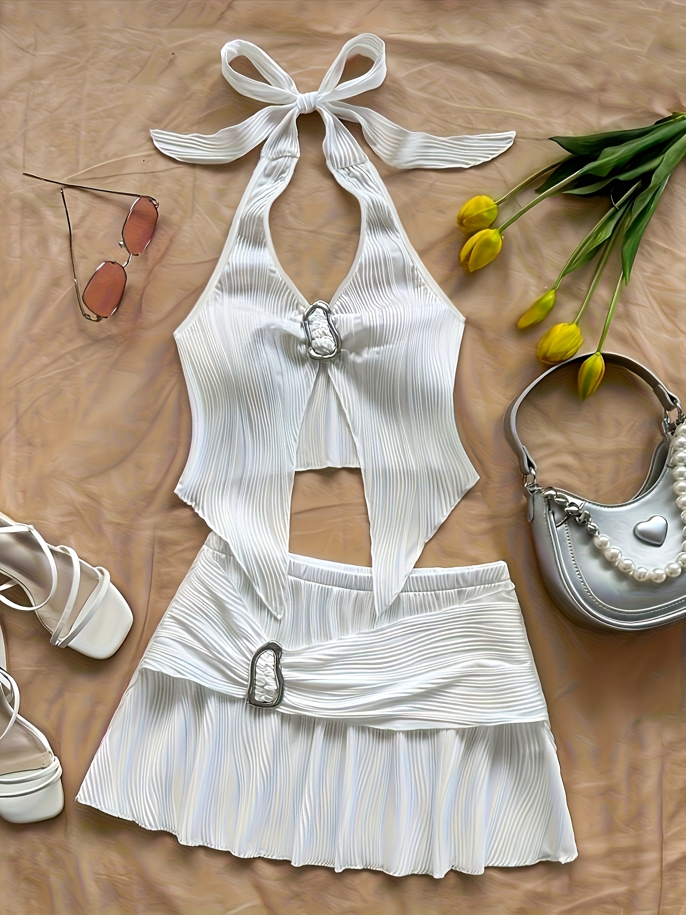 [Elegant Summer Two-Piece Set] Elegant Women's Summer Two-Piece Set - V-Neck Strap Top with Bow Detail & High-Waisted Skirt, Polyester Blend, Textured Fabric, Perfect for Spring/Summer, Casual Attire