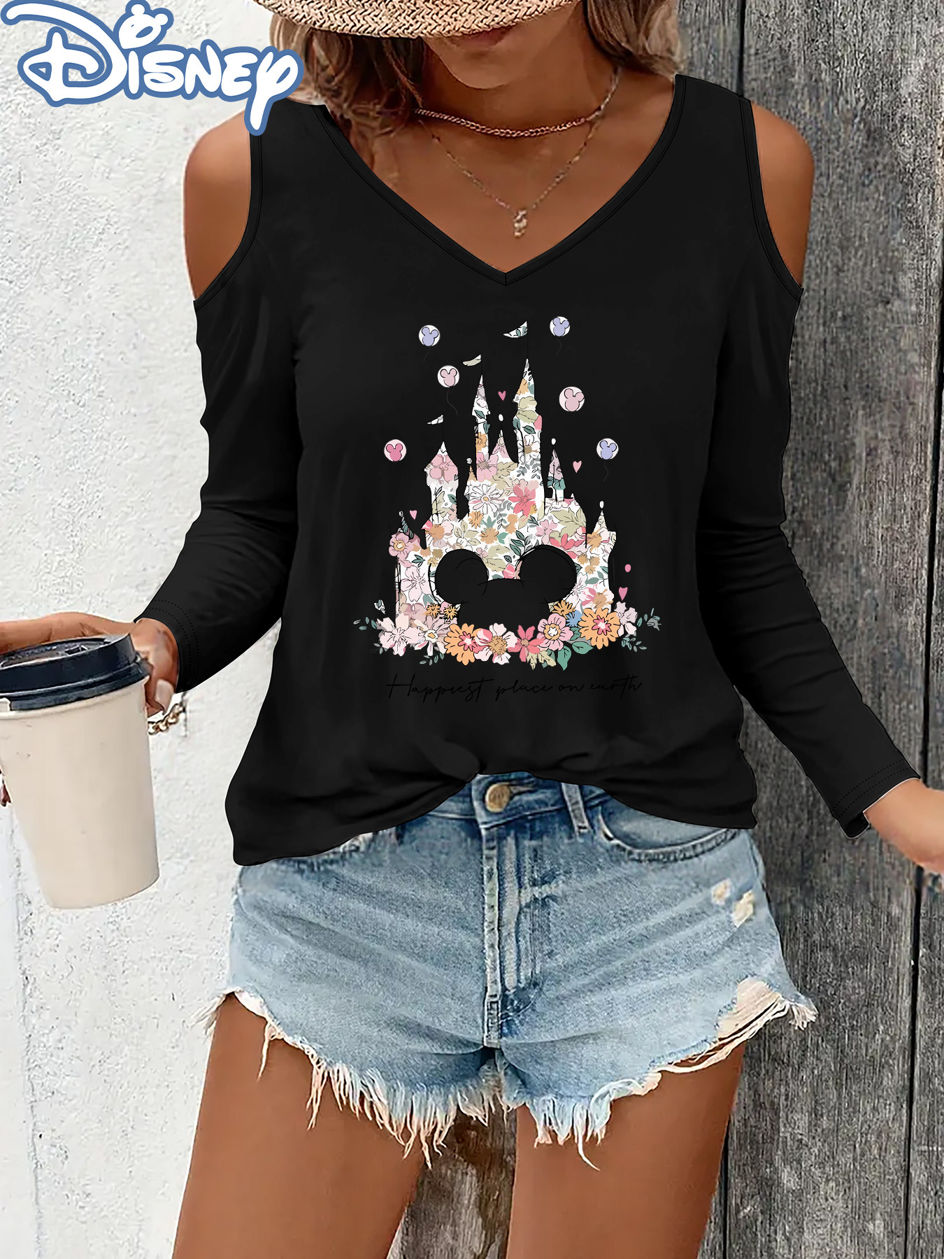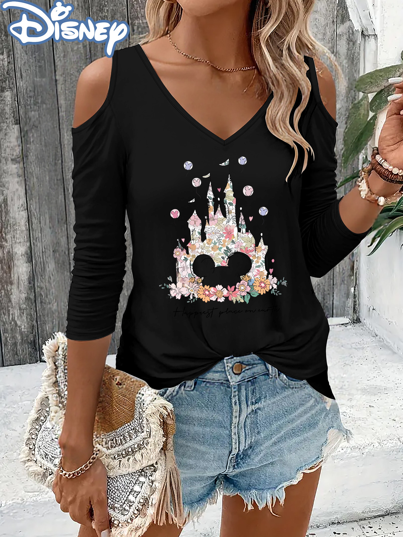 Women'S Disney Princess Graphic Off-Shoulder Long Sleeve T-Shirt - V-Neck, Black with Colorful Floral Crown & Castle Design, Perfect for Spring/Fall, Disney Shirts
