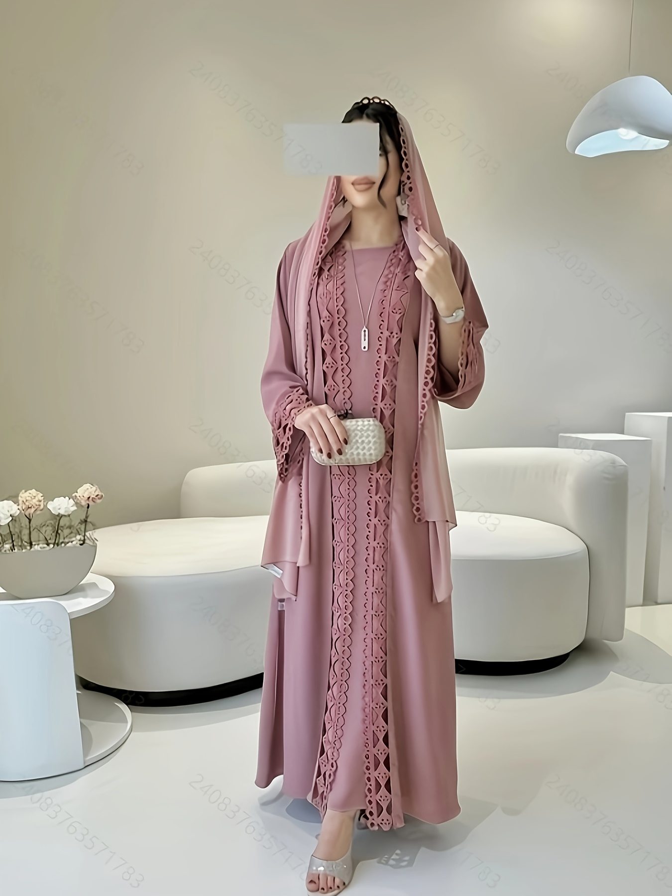 Middle Eastern Muslim Fashion Long Sleeve Embroidered Contrast Lace Patchwork Abaya Dress and Hijab Three-Piece Set