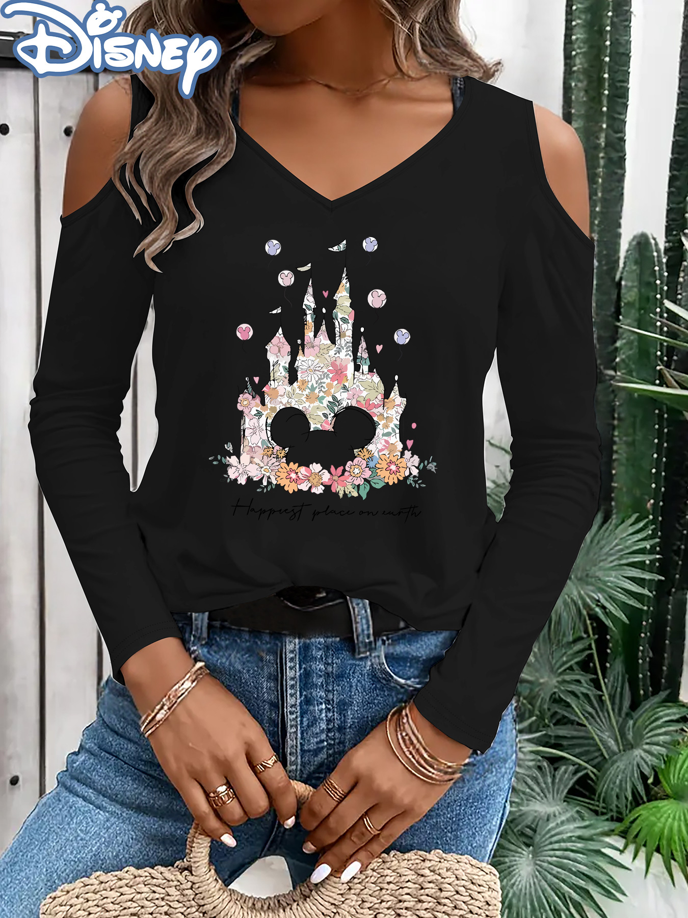 Women'S Disney Princess Graphic Off-Shoulder Long Sleeve T-Shirt - V-Neck, Black with Colorful Floral Crown & Castle Design, Perfect for Spring/Fall, Disney Shirts