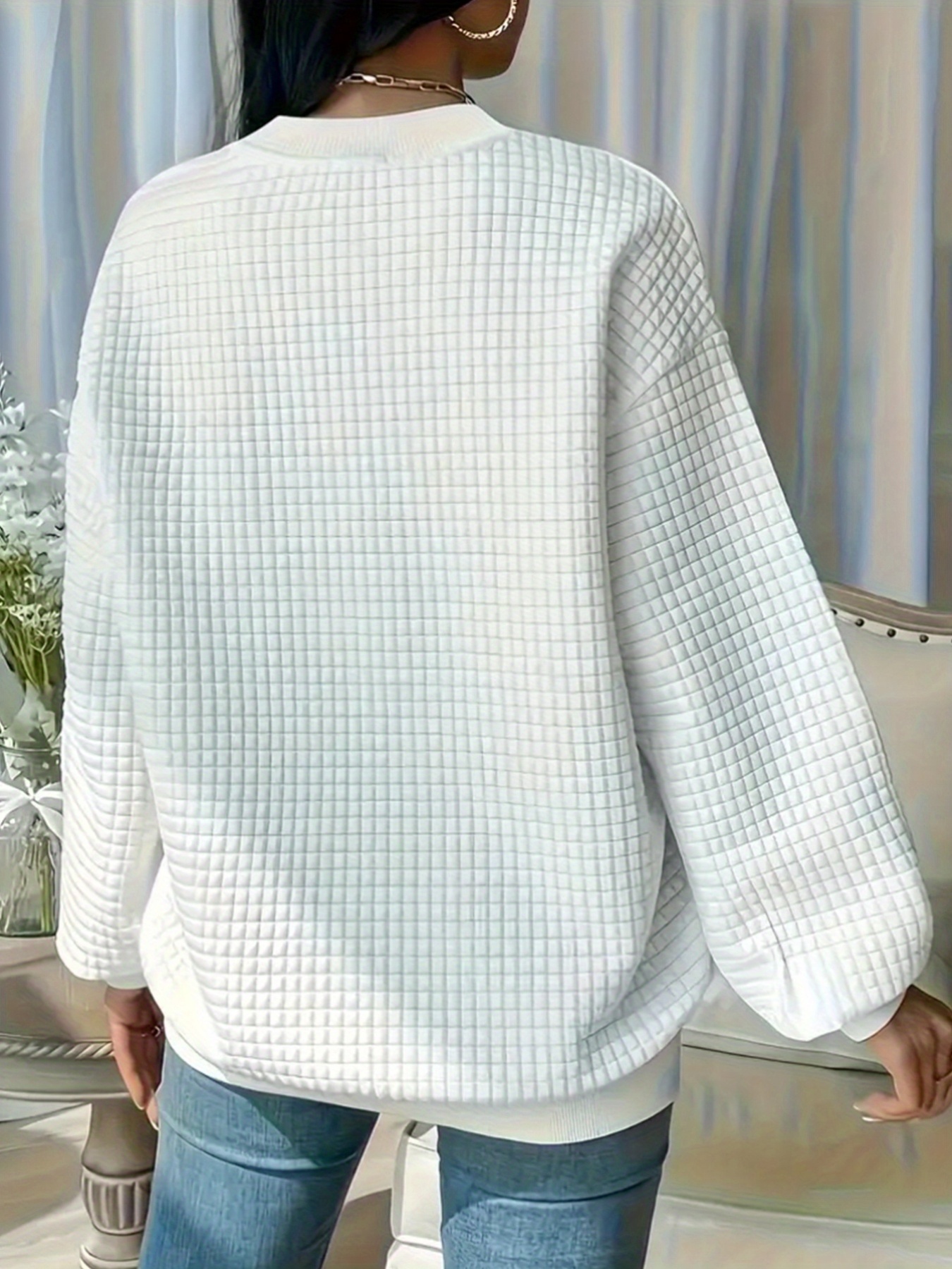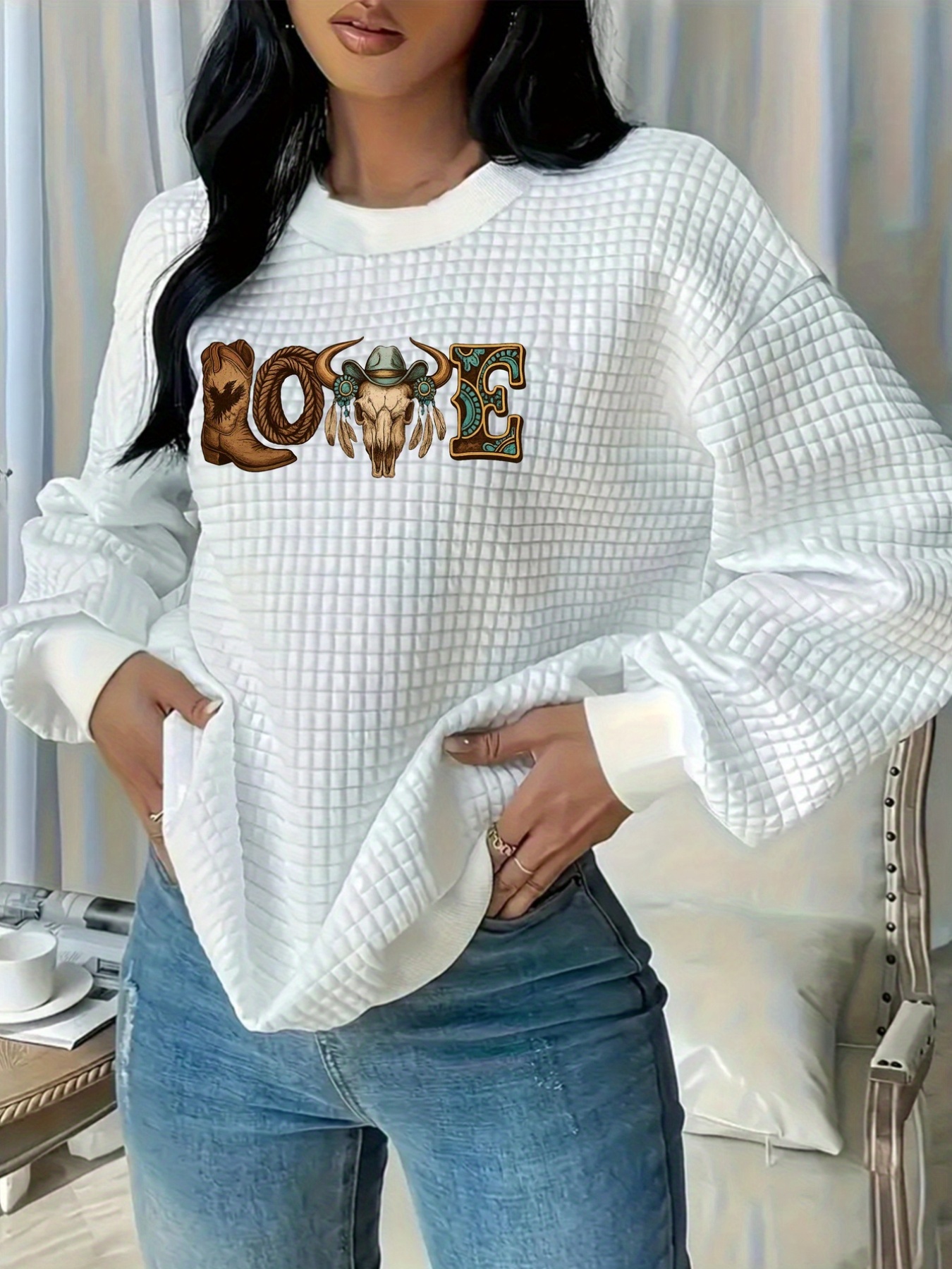 Women's Western Cowboy Print Waffle Sweatshirt - Cozy Bull Skull & Cactus LOVE Lettering Design, Casual Fall Winter Pullover, Machine Washable White Sweater for Country-Themed Outfits