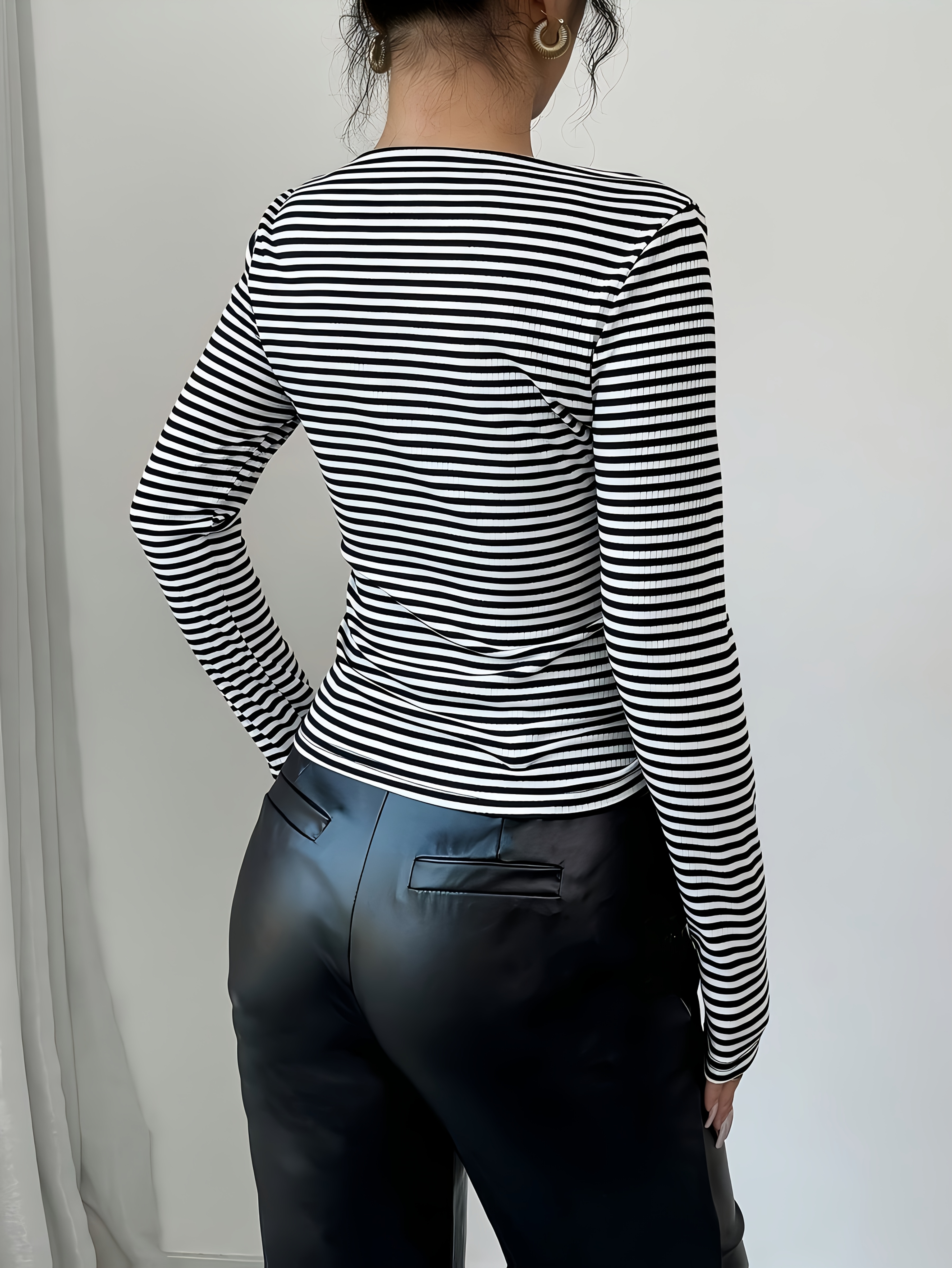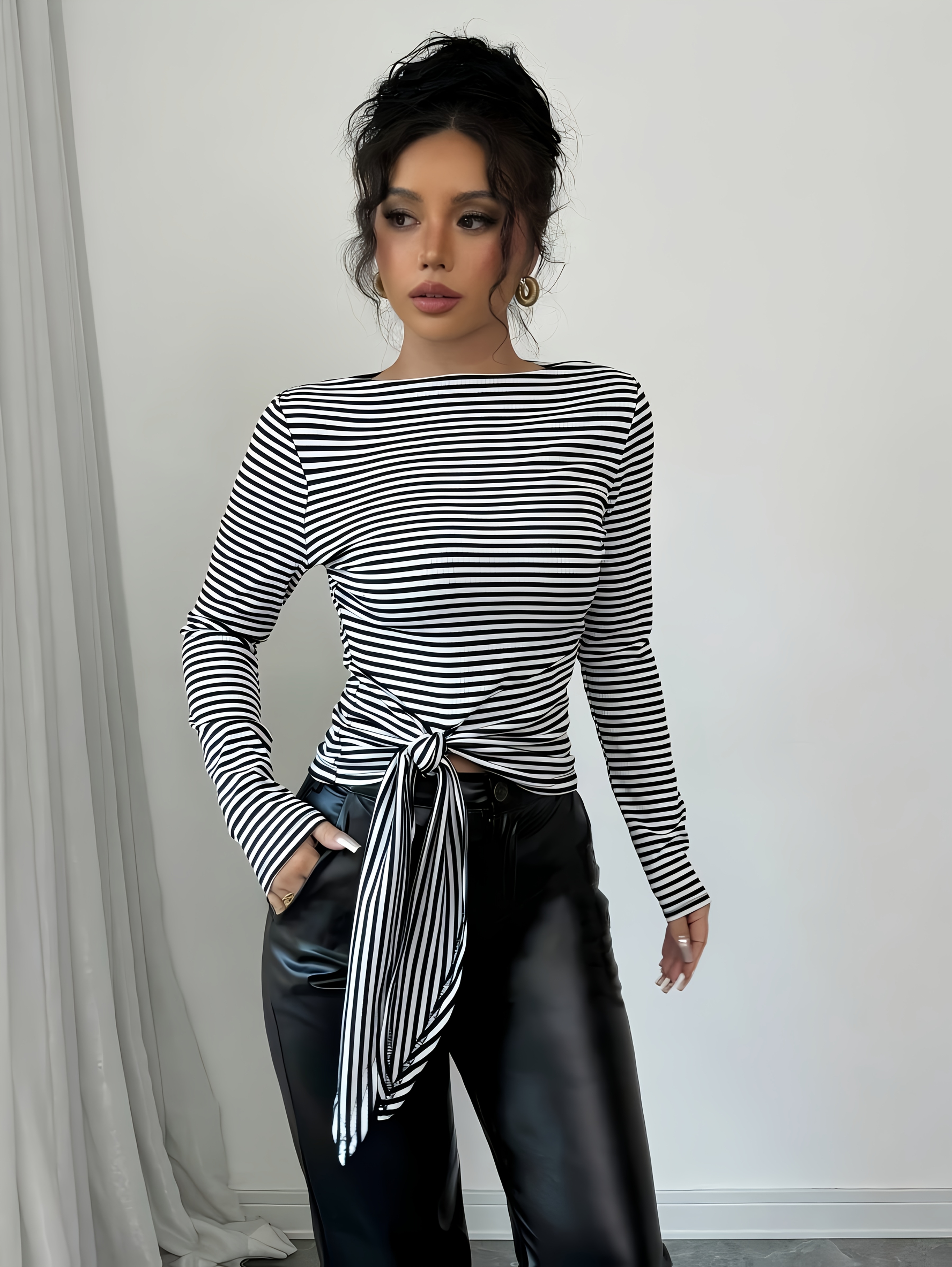 [Casual Striped T-Shirt] Polyester Women's Casual Striped T-Shirt with Tie-Front Detail | Black & White Vertical Stripes, Long Sleeve, Round Neck, Perfect for Spring/Fall, Everyday Fashion, Casual Wear
