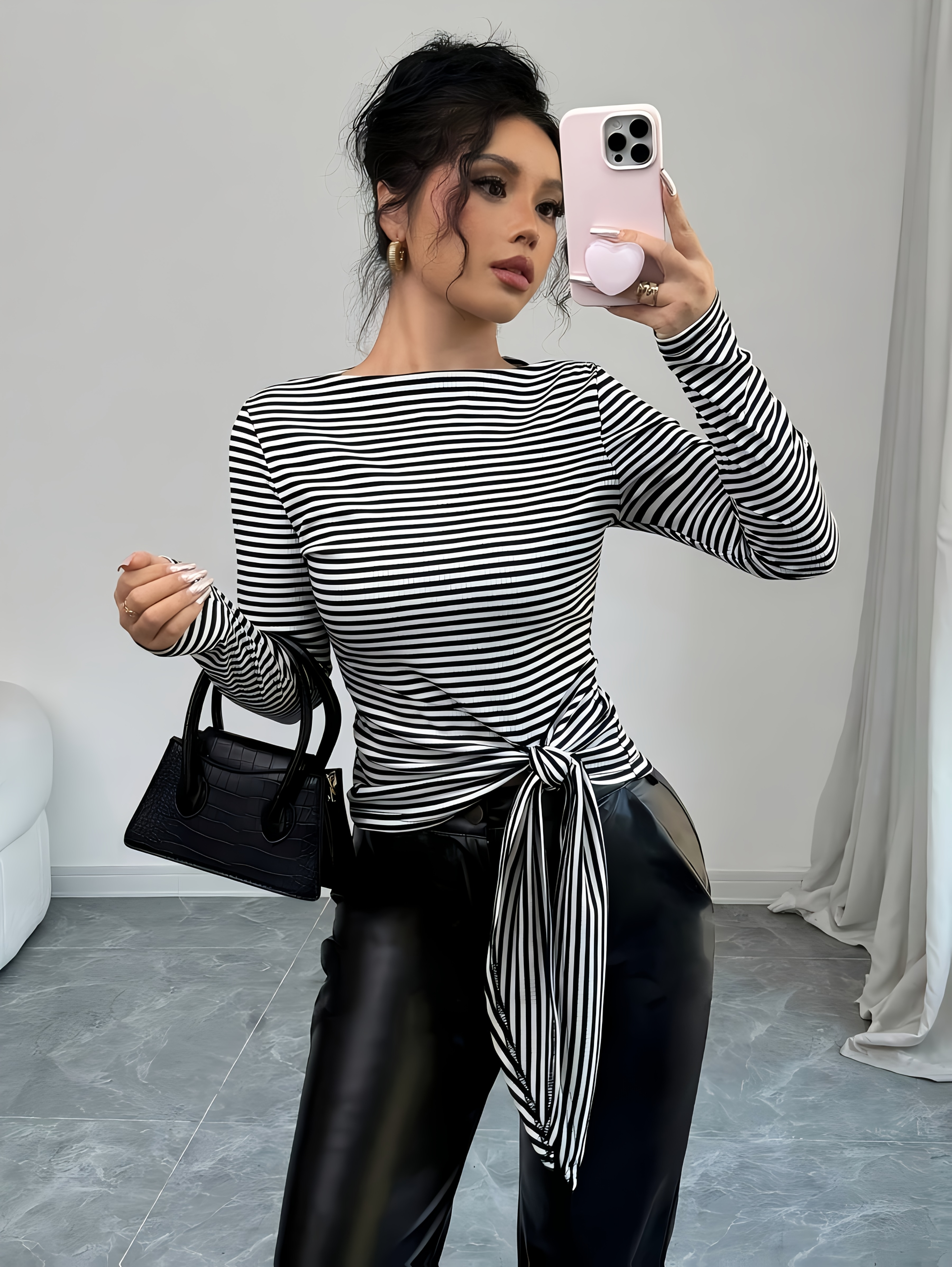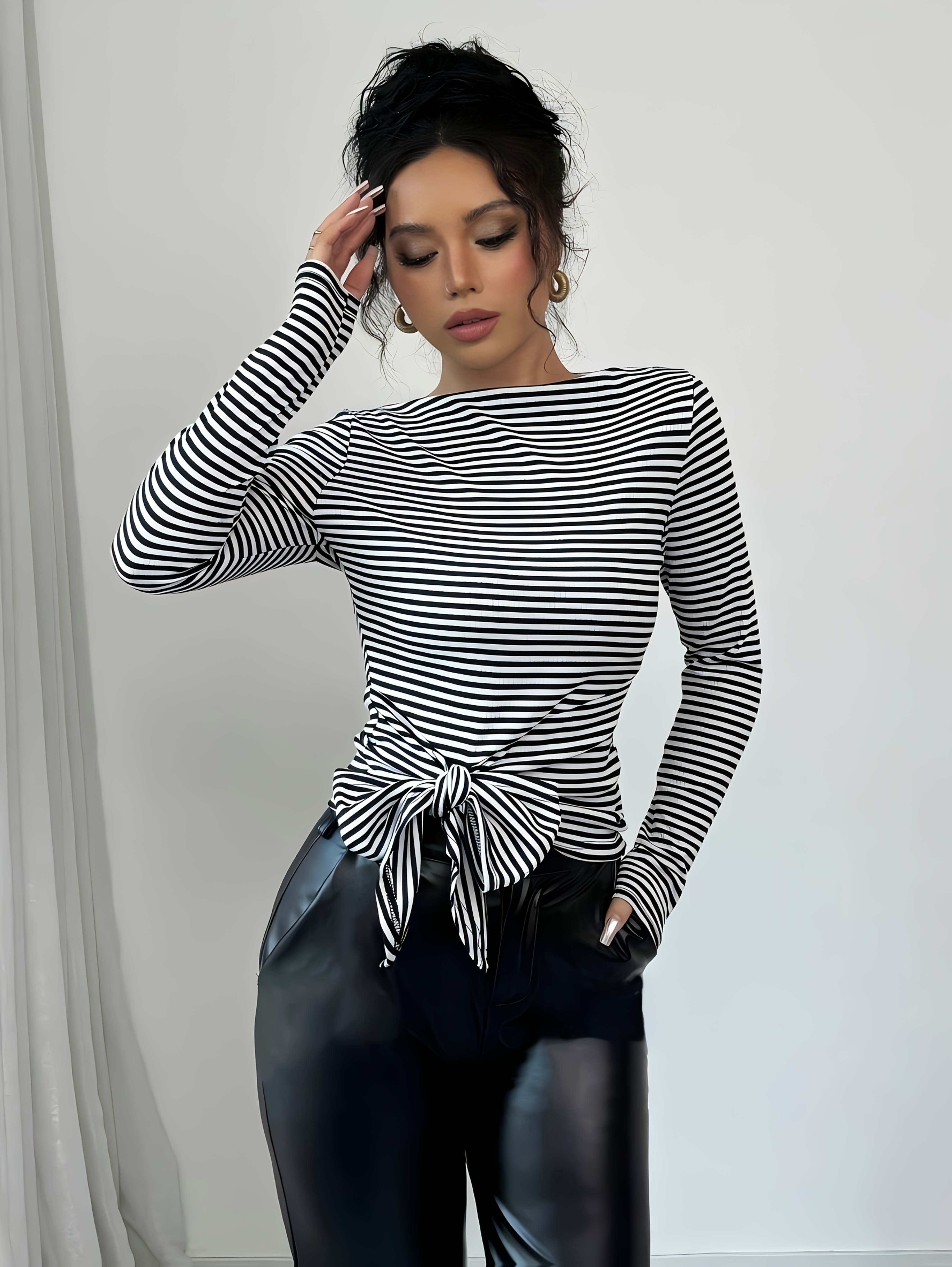 [Casual Striped T-Shirt] Polyester Women's Casual Striped T-Shirt with Tie-Front Detail | Black & White Vertical Stripes, Long Sleeve, Round Neck, Perfect for Spring/Fall, Everyday Fashion, Casual Wear